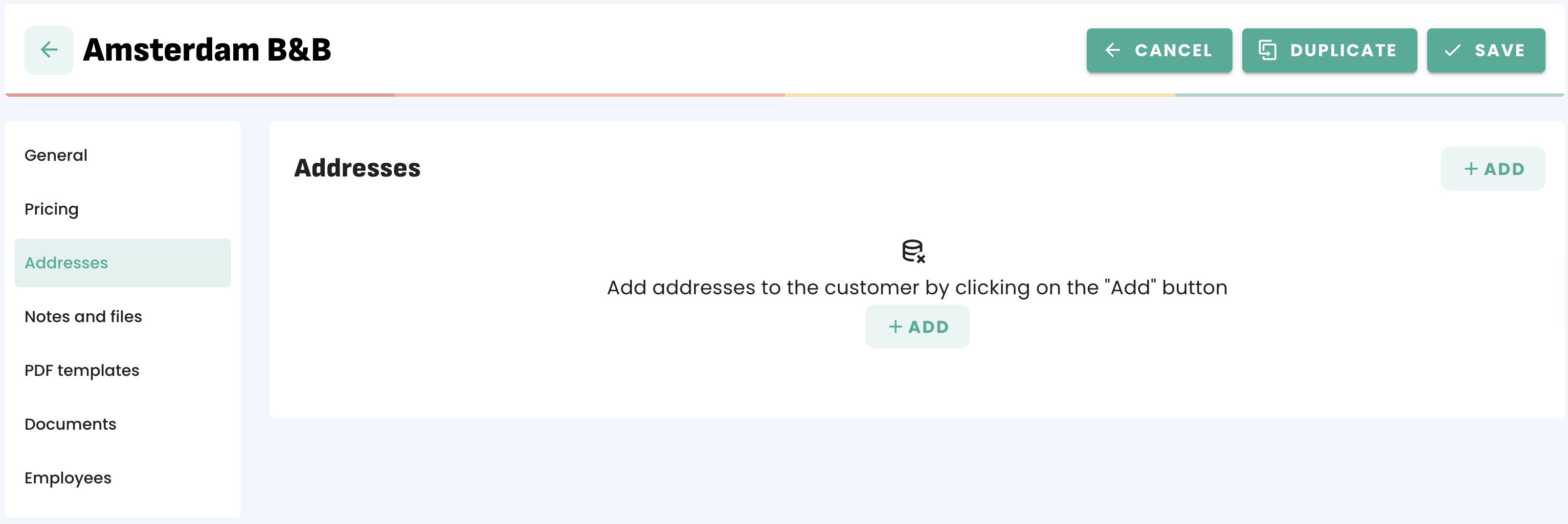 To add an address to your customer, open the customer card (do not click on "Edit"). Click on "ADD" in the "Addresses" section to create a new address.