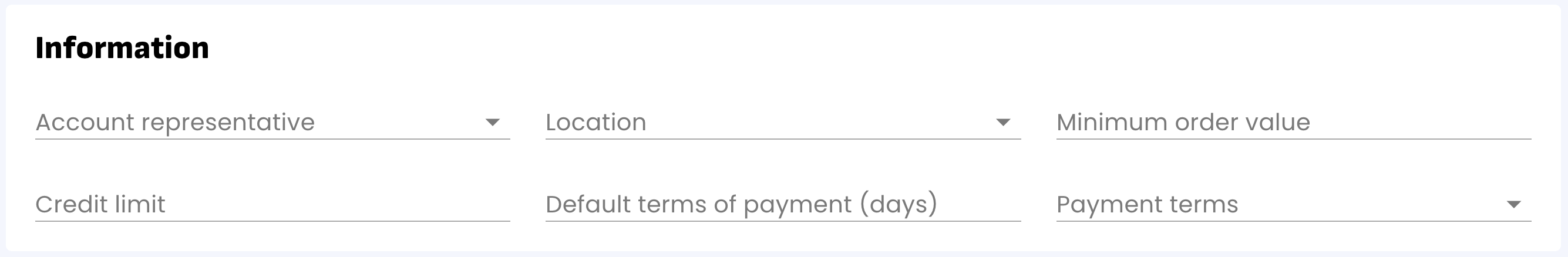 - Add Detailed information: You can choose to set a default minimum order value, location, price level, tax, currency, discount rate, terms and language for PDFs. By default ('Use default setting'), erplain will use the user language.