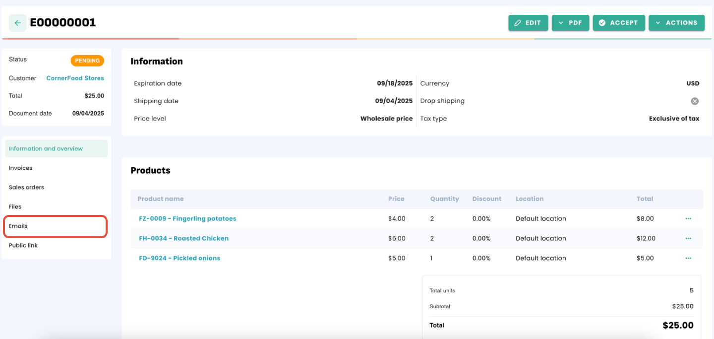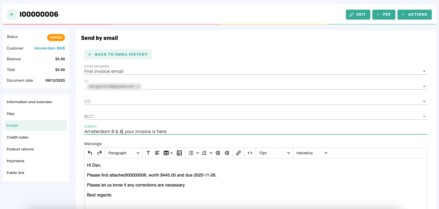 Note that when sending the email, you will see the customer or supplier emails addresses available in the email list.