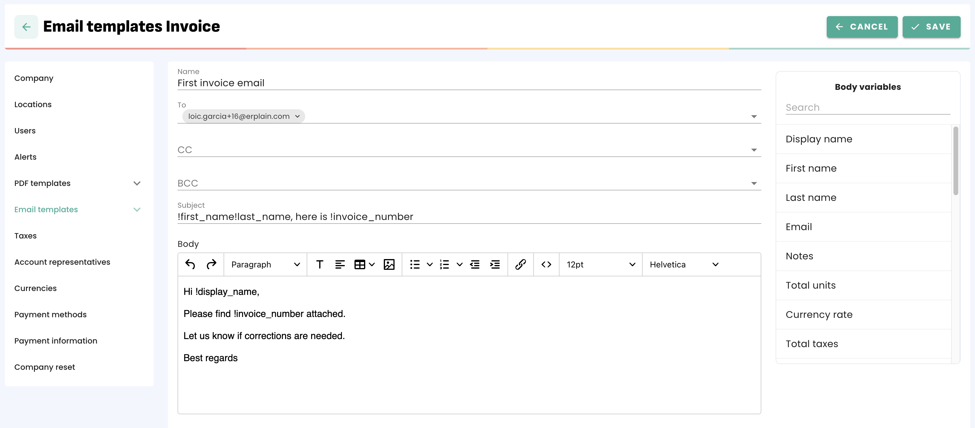 These templates are already filled with the variables available in Erplain, like the client's name. You just need to customize the fields between brackets to use them.