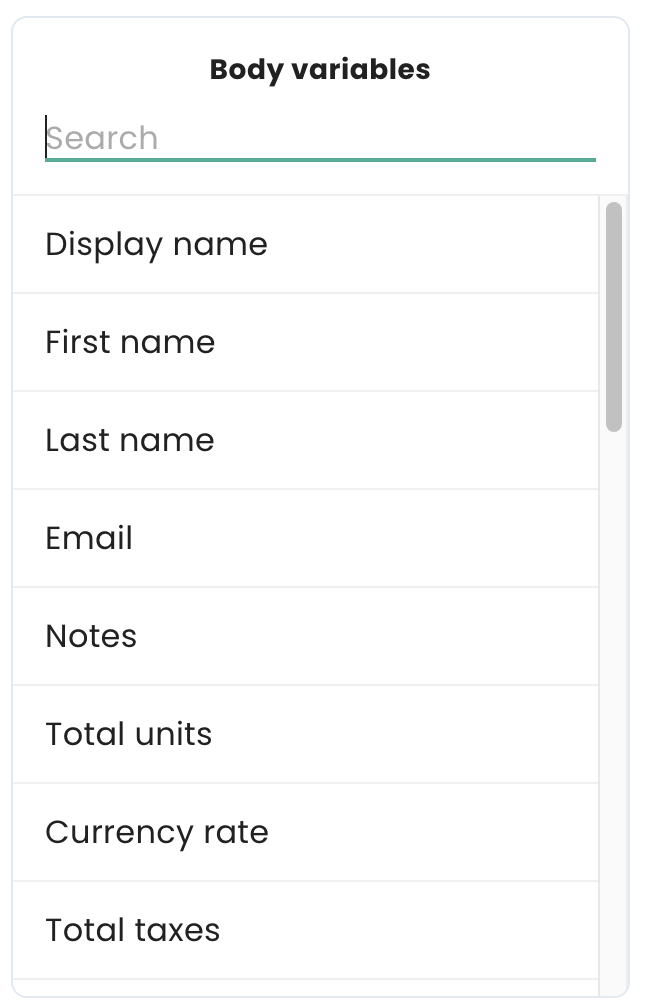 The list of these placeholders is on the right side of the template page. Click on any placeholder to add it to the body of the email: