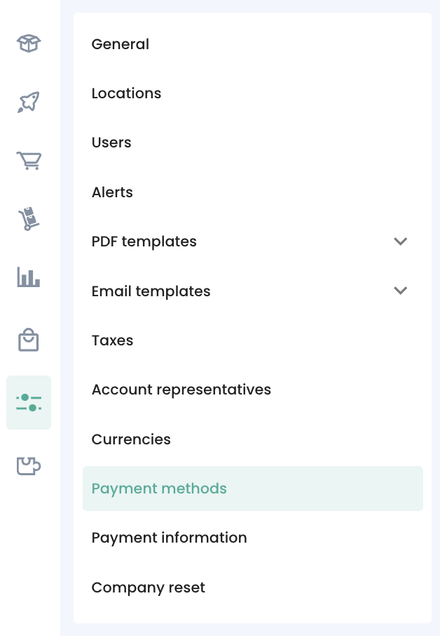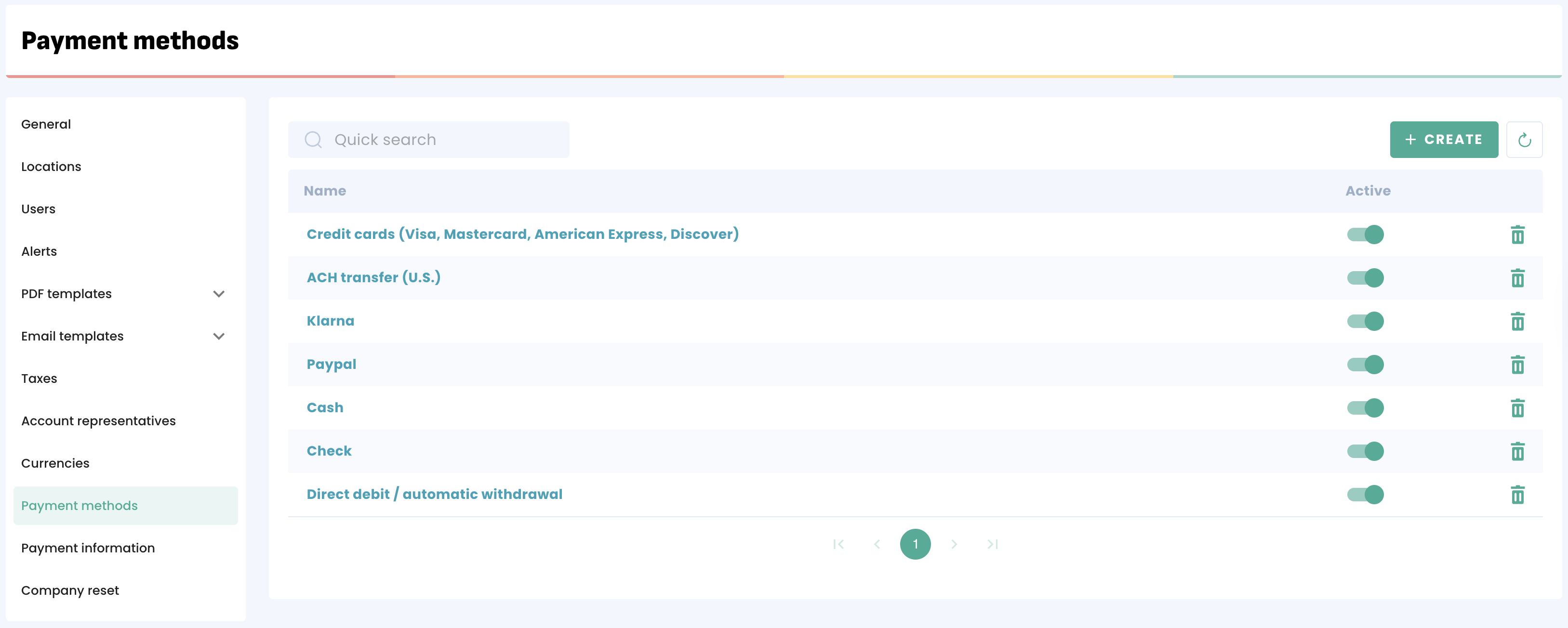 You can create and manage your payment methods from the Settings > Payment methods menu: