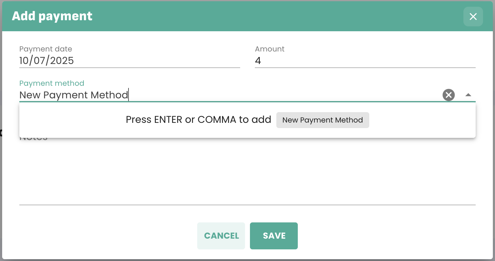 Please note that you can also create your Payment methods directly when adding a payment in the invoice. Simply start typing the text and press enter or click on the underlined text: