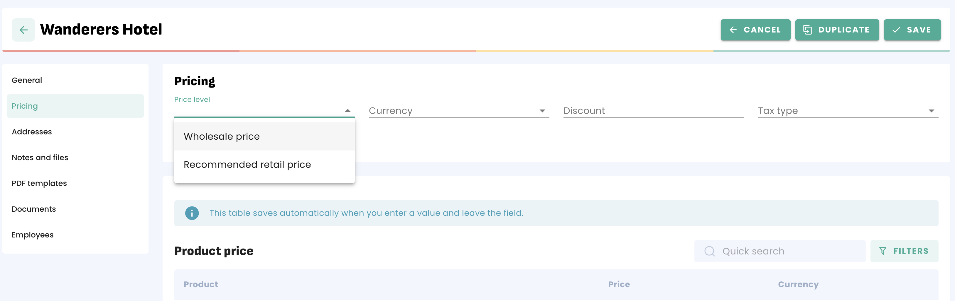 Wholesale Price (WP) and Recommended Retail Price (RRP) are the default selling price levels used when creating Estimates, Sales Orders and Invoices. You can assign a price level to each of your customers directly in the customer profile (Menu Contacts > Customers).