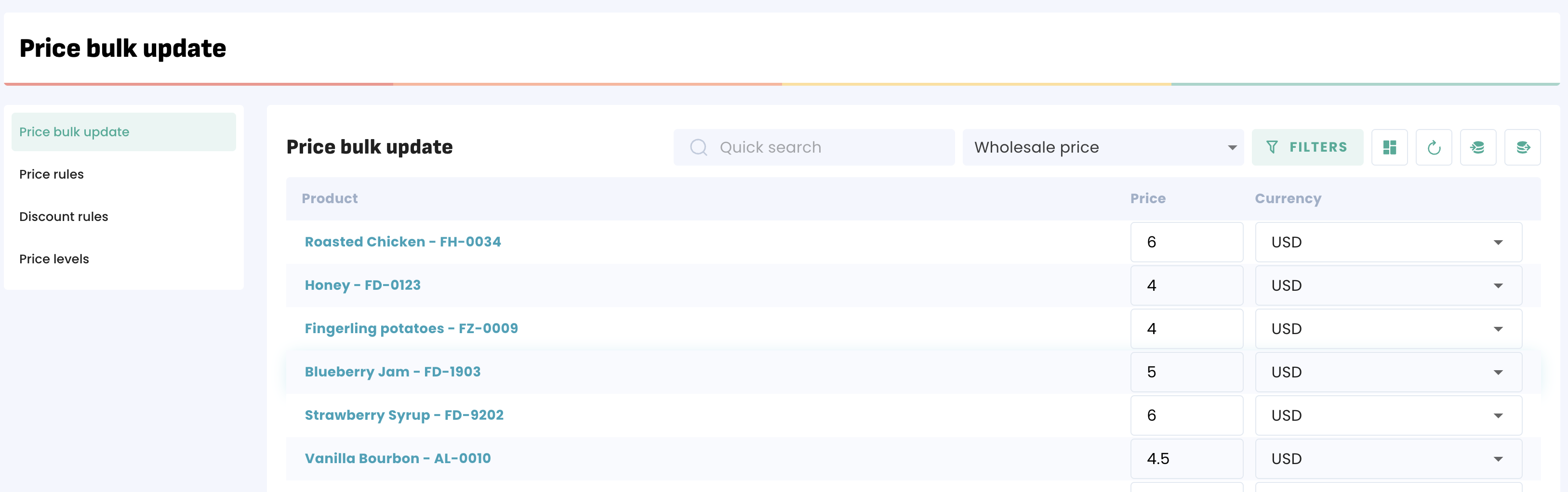 From this page, you can filter by product or price level for example. Then simply update your prices and save: