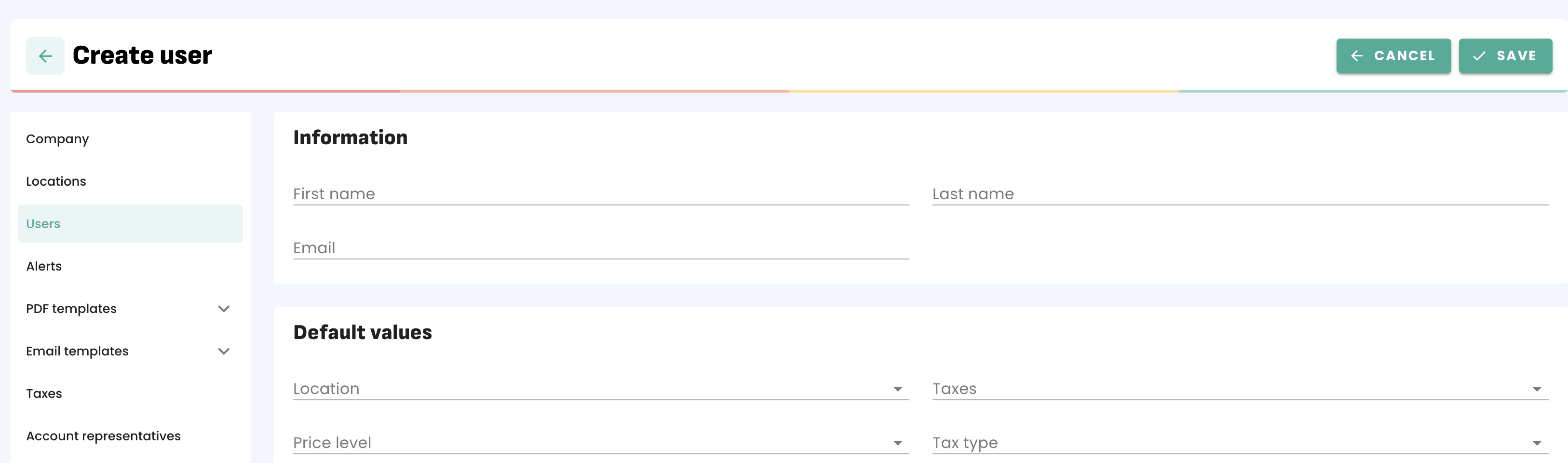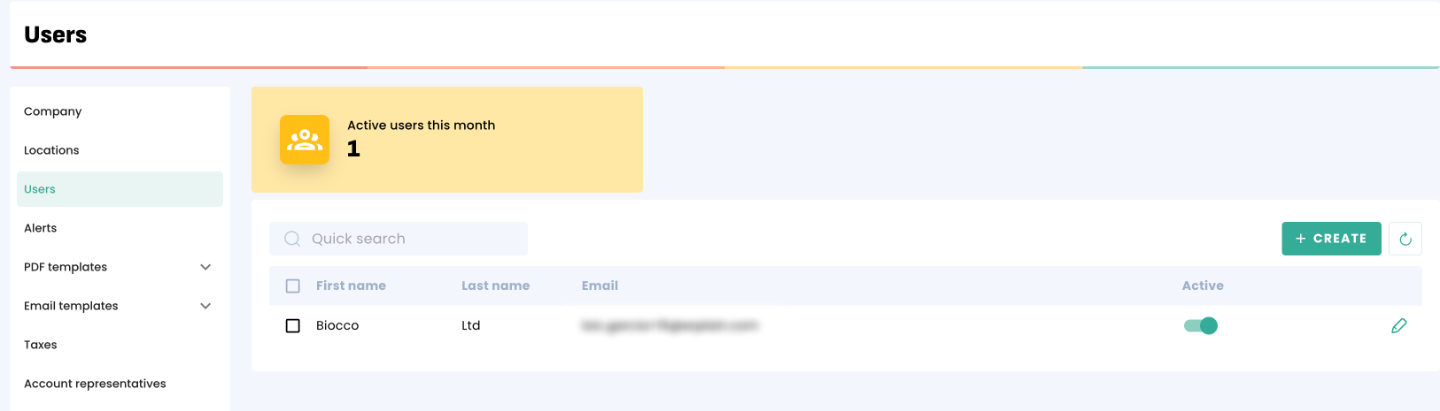 To create a user, first go to the settings, then to the dedicated subsection. Next, click on “Create”: