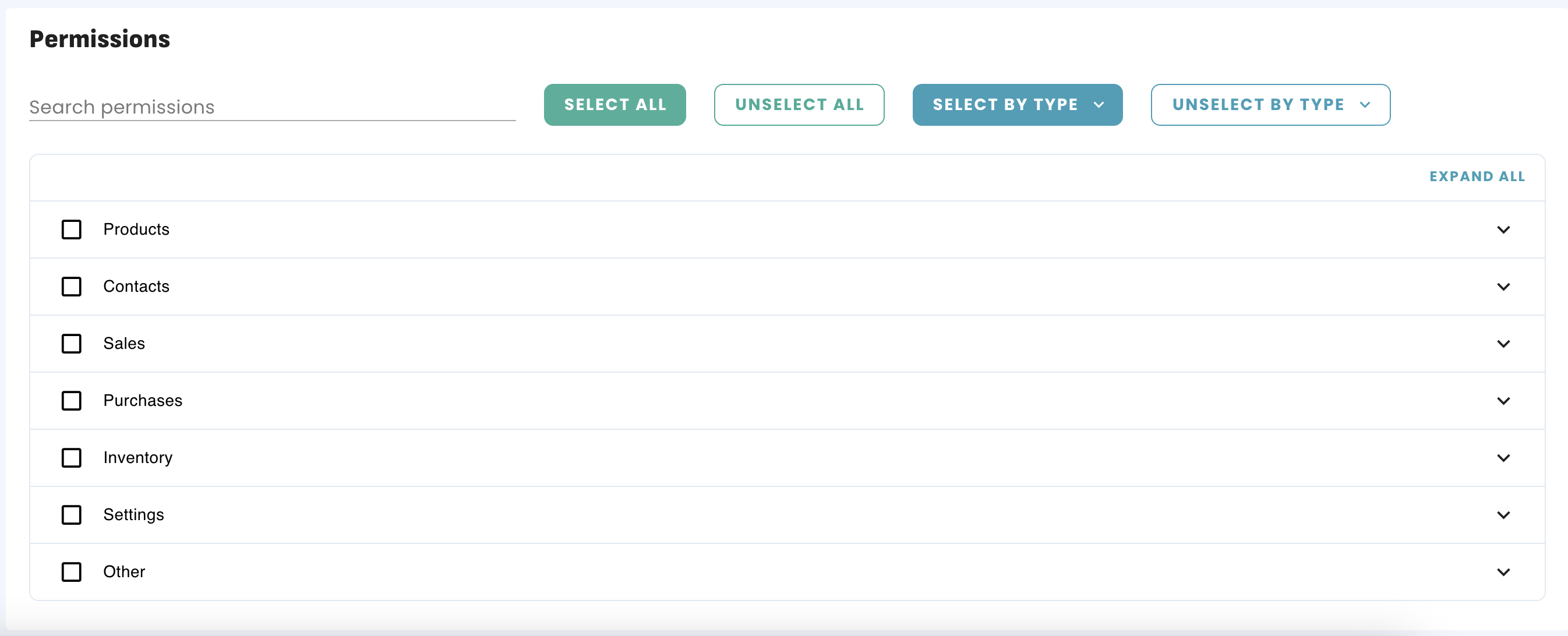 You can choose from the main categories available in Erplain. You can also select or unselect the entirety of a type of permission.