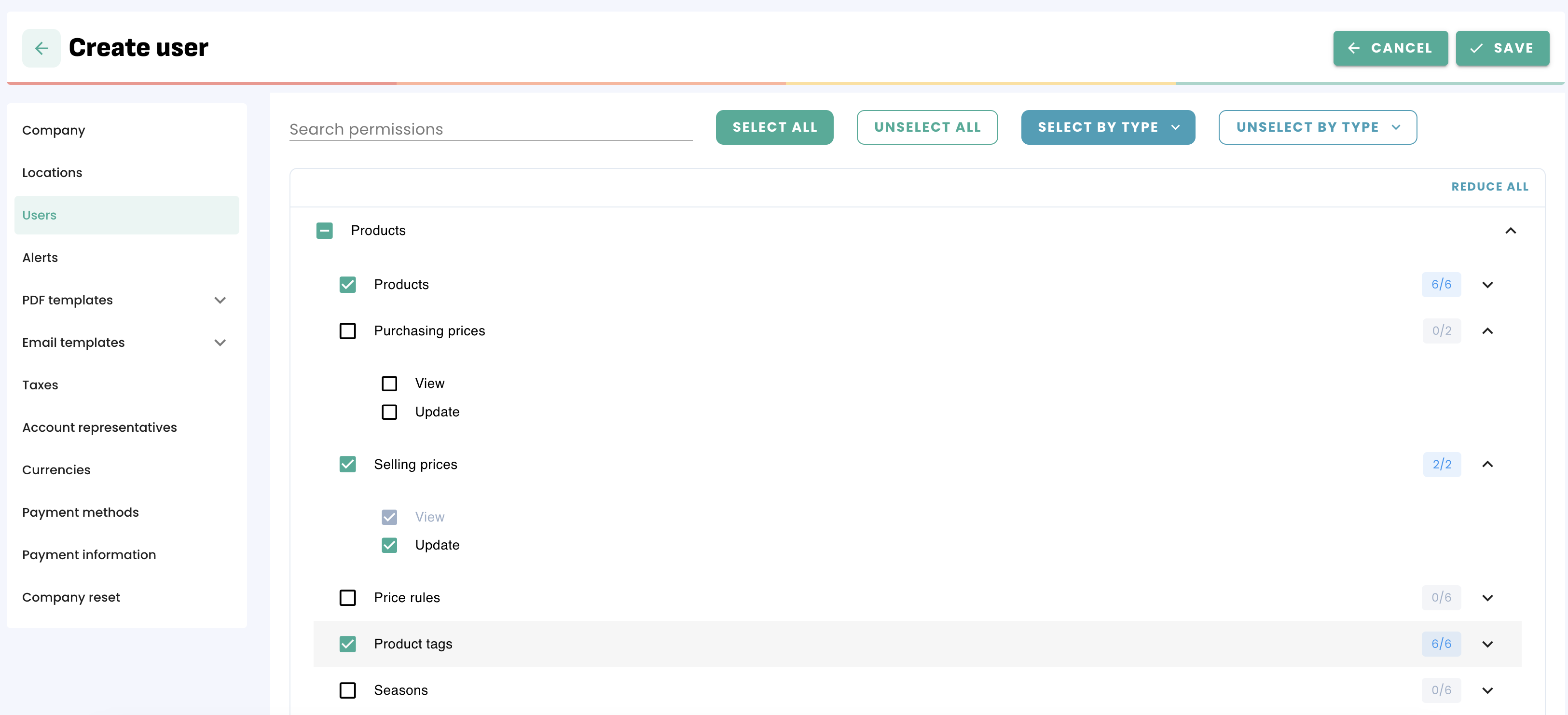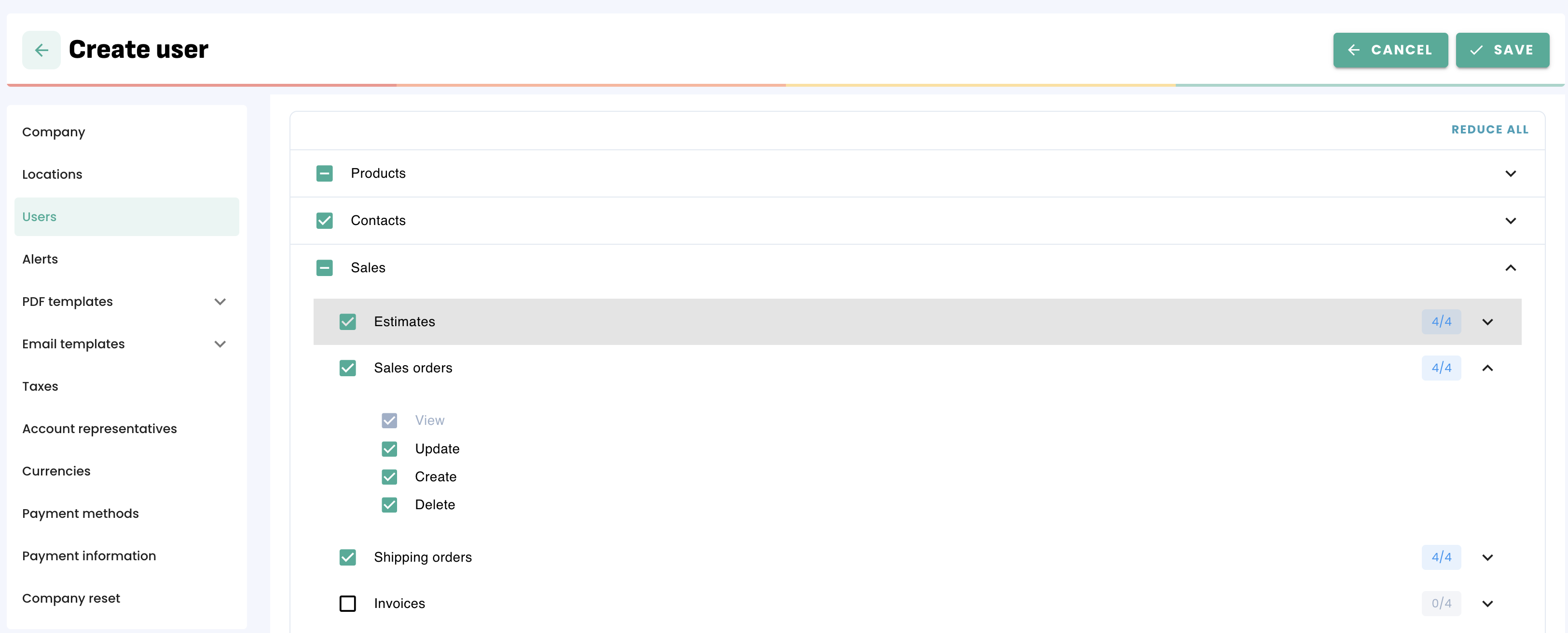 Advanced permissions can, for example, allow a user to enrich the product catalog without being able to delete or deactivate a product. Regarding the sales cycle, it is also possible to ensure that a user has access to estimates and purchase orders, but not to invoices, for instance.