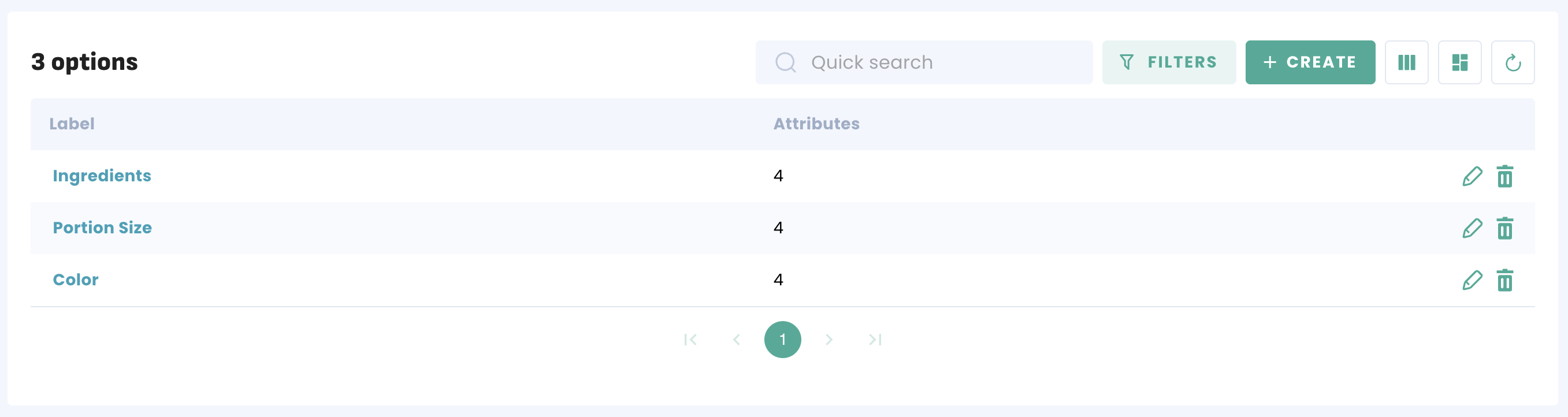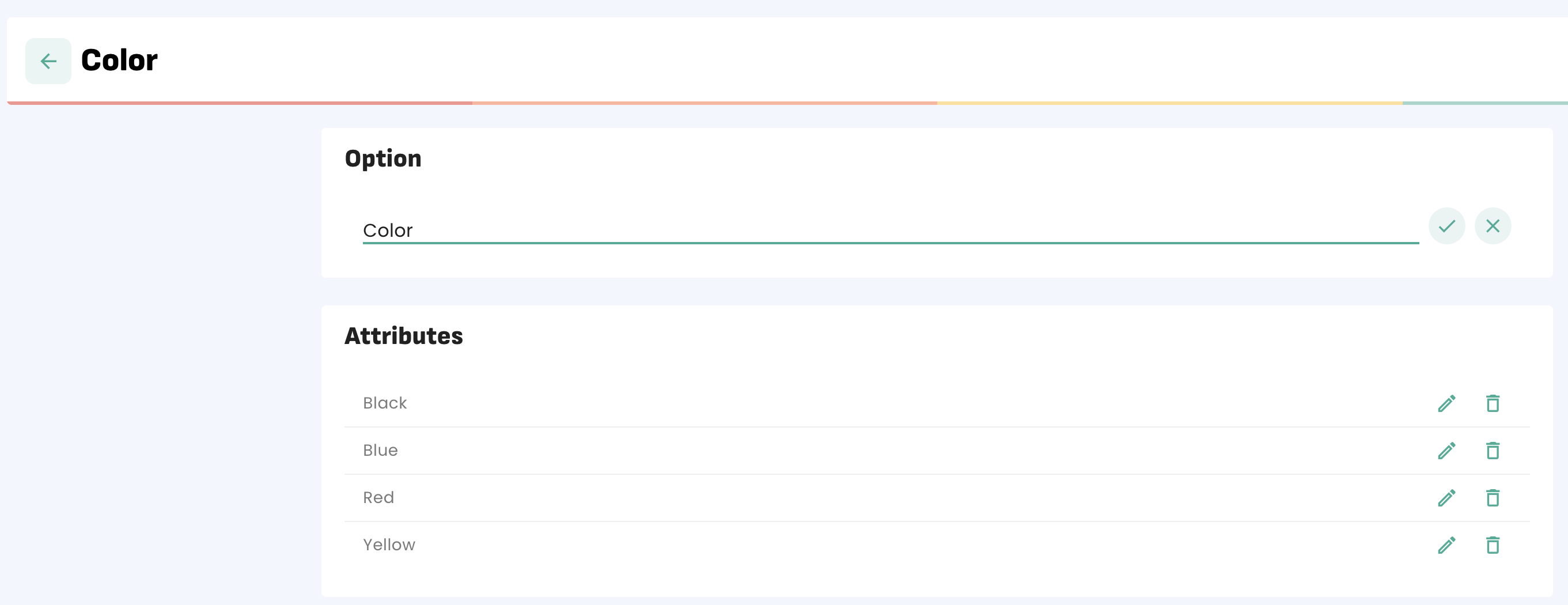 - By default, we have created three options: Colour, Size and Material but you can rename them, and add new ones.