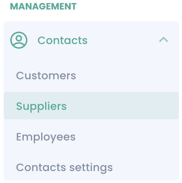 From the menu 'Contacts' > 'Suppliers', you can view, search, create and export suppliers.