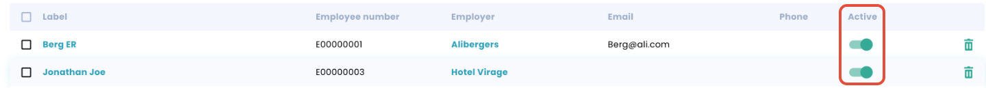 2. In the 'ACTIVE' column, place your mouse on the contact you wish to enable/disable and click on the following button. You can also delete them from here by clicking on the bin: