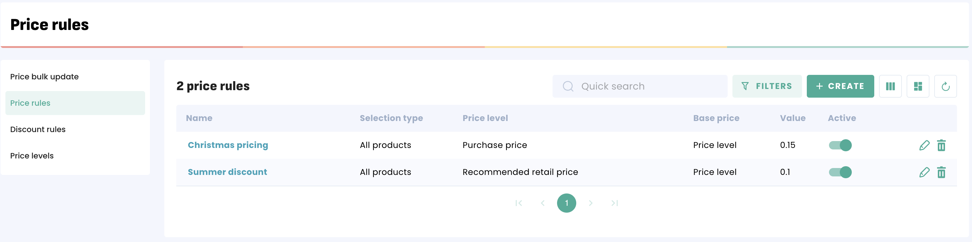 To create and manage price rules, open the menu: Products > Prices and discounts: