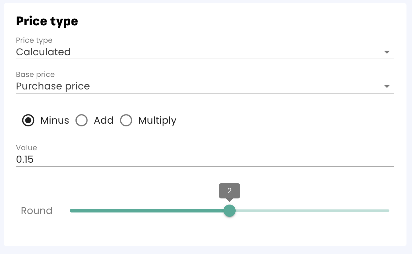 'Calculated' will calculate a new price based on a formula. If you choose calculated, you will need to select additional information like the base price.