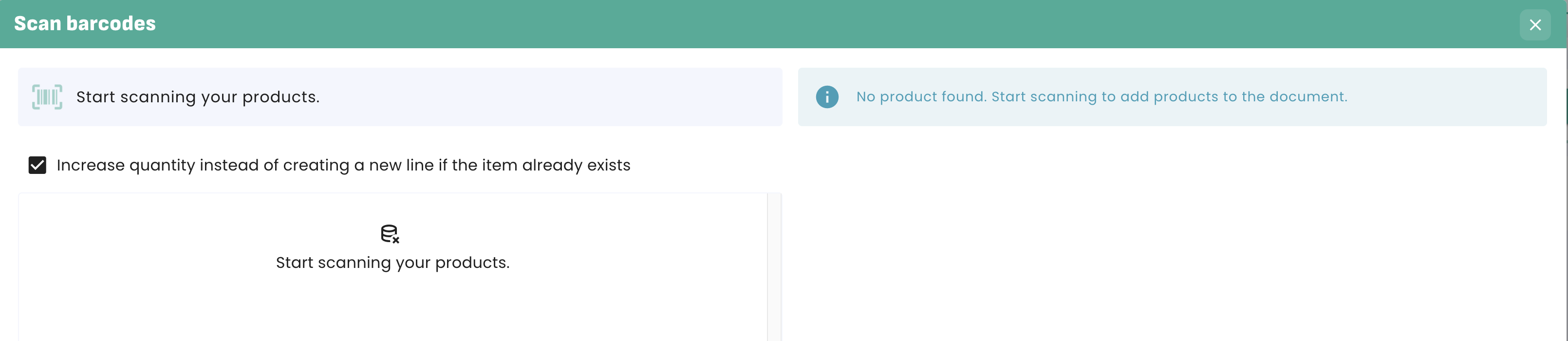 Step 2: A new window will open on your screen. You can now scan your products' barcodes. If this barcode is assigned to a product in erplain, it will be added in the list. You can scan the barcode multiple times, the quantity will increase. You can also scan one time and update the quantity on the right side.