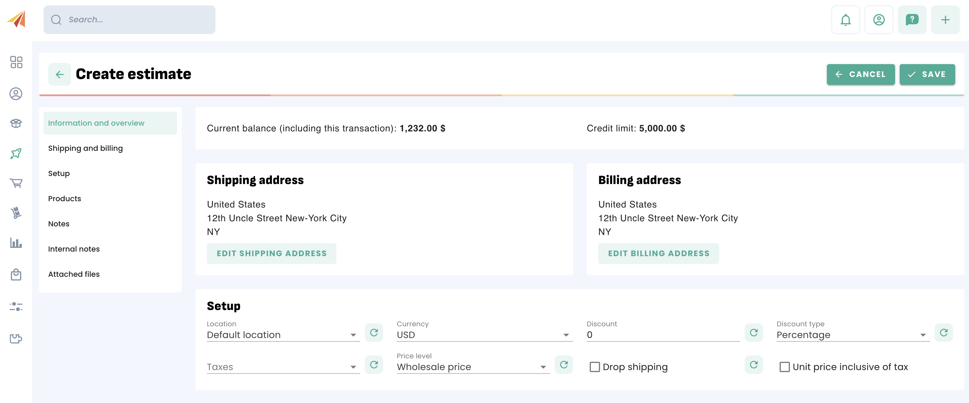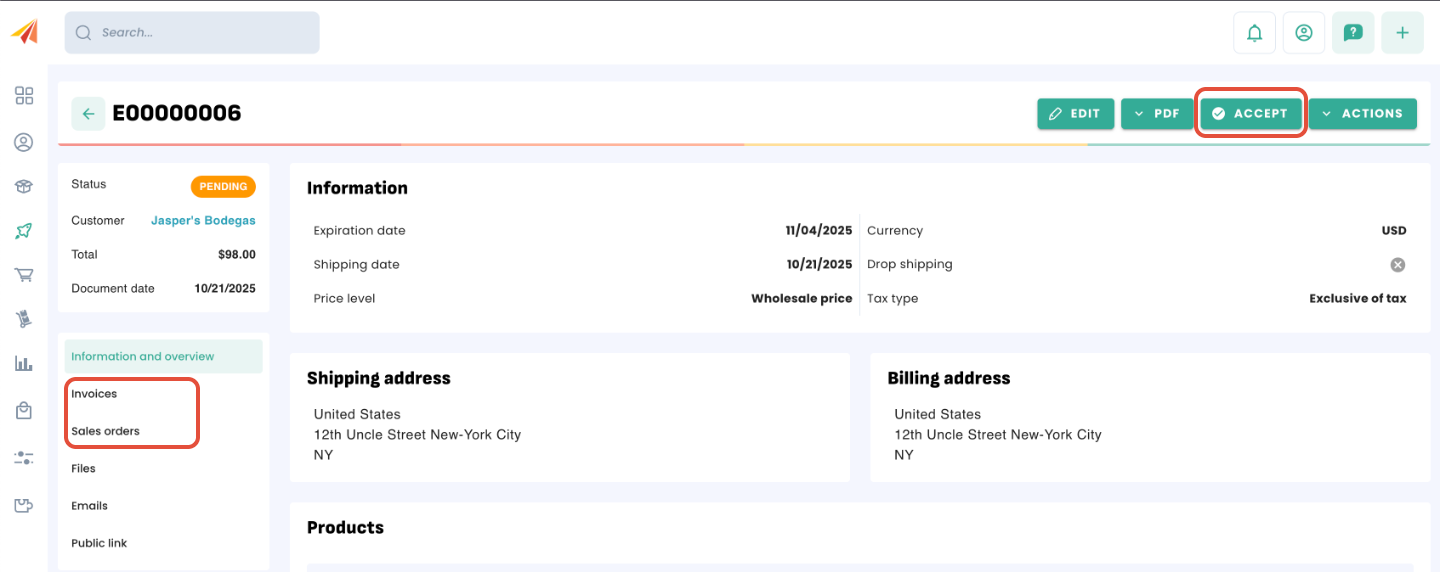 After creating an Estimate, you can continue the sales workflow by accepting the estimate before creating a Sales order or an Invoice. Click on the Sales order or Invoice sections to proceed: