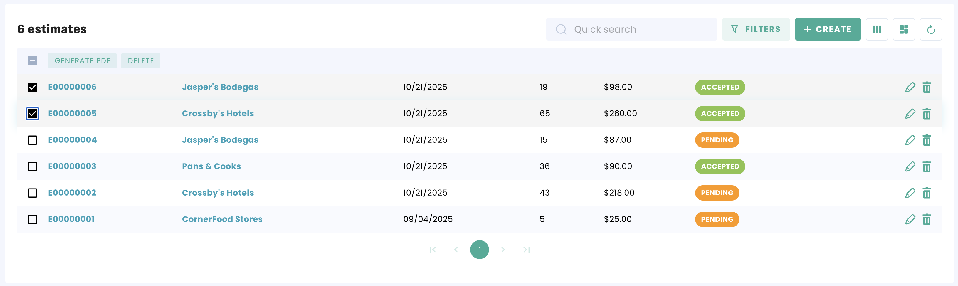 After the estimate is created, the status is "Pending". You can also change the status of the estimate once you hear back from your customer. Accept it by clicking "Accept". The status of the estimate will automatically be updated to 'Accepted' if you create a sales order or invoice from the estimate.