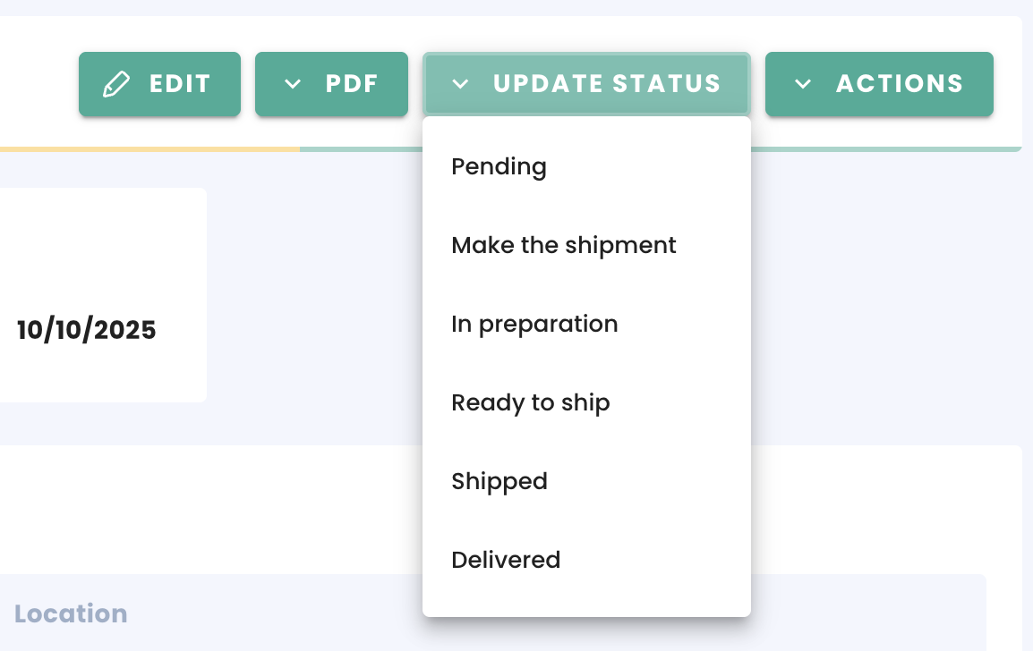 You can update the Shipping Order status based on your company process: 'Pending', 'Make the shipment', 'In preparation', 'Ready to ship', 'Shipped' and 'Delivered'.