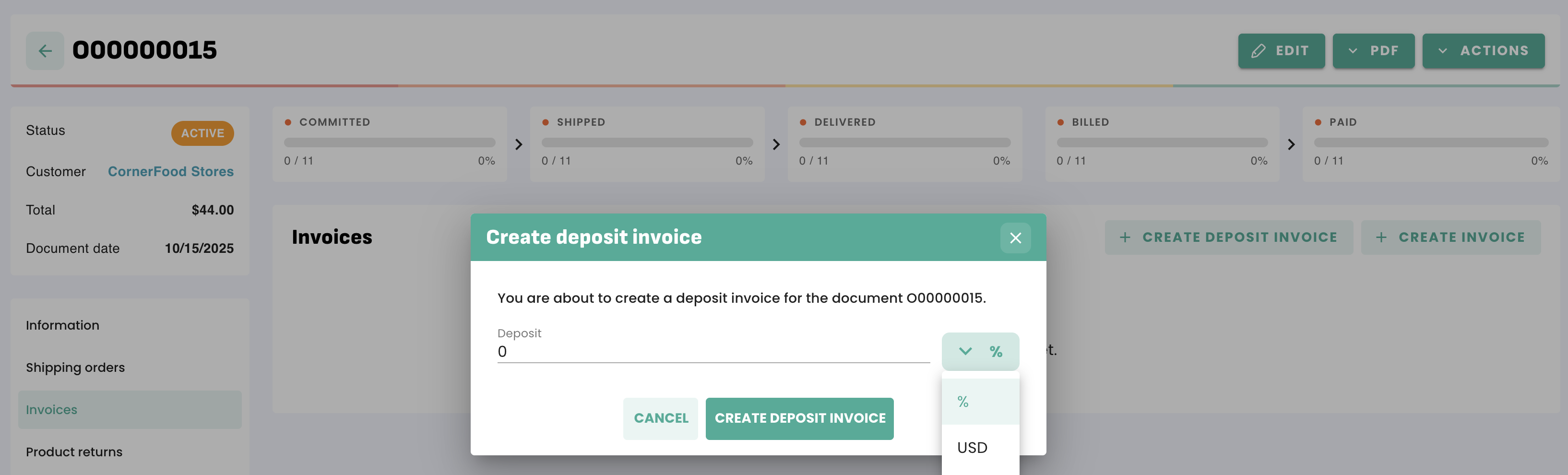 Once you click on Deposit, select the percentage or the amount for the deposit and click on create: