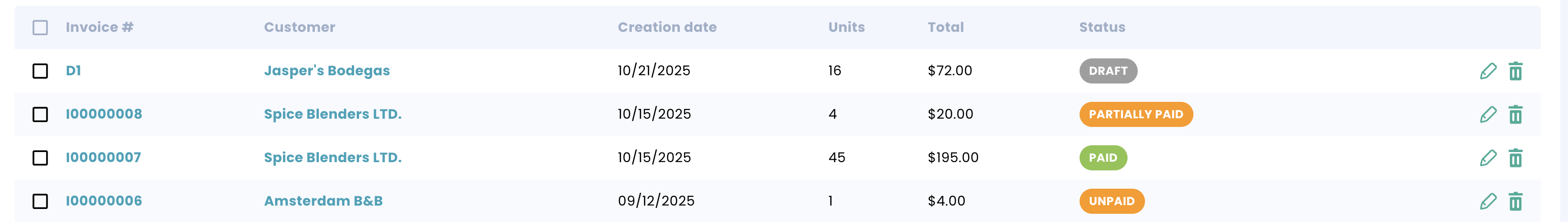 Draft invoices, to avoid any confusion appear with a specific number chain “#D” and the “Draft" status to set them apart from the finalized Invoices (with “#I” number chain) easily.