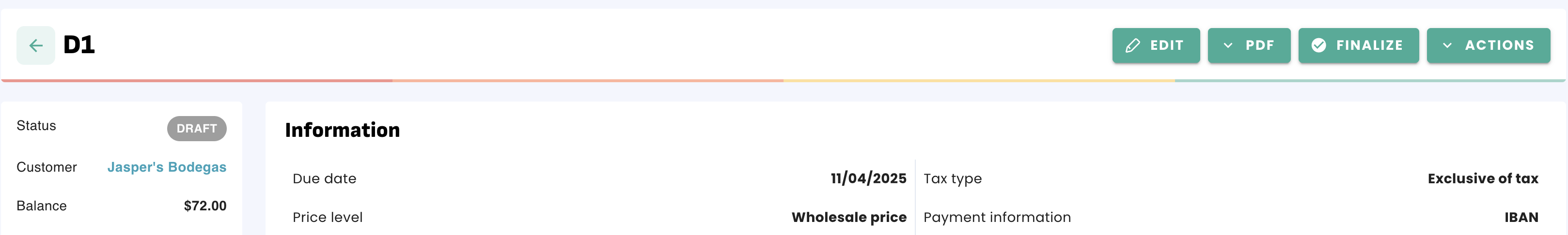 The creation of the draft invoice can be used as a teaching tool when training new users to your account, or as a workaround for proforma invoices. Activating this option will add an extra step to the sales documents flow.