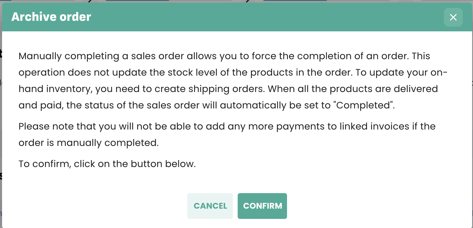 You can choose to manually complete your orders when you no longer need to continue the selling or purchasing process. This action is manual and can be undone.