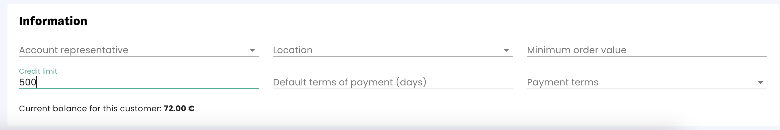 To set a credit limit, enter the amount in the customer profile as shown in the screenshot below:
