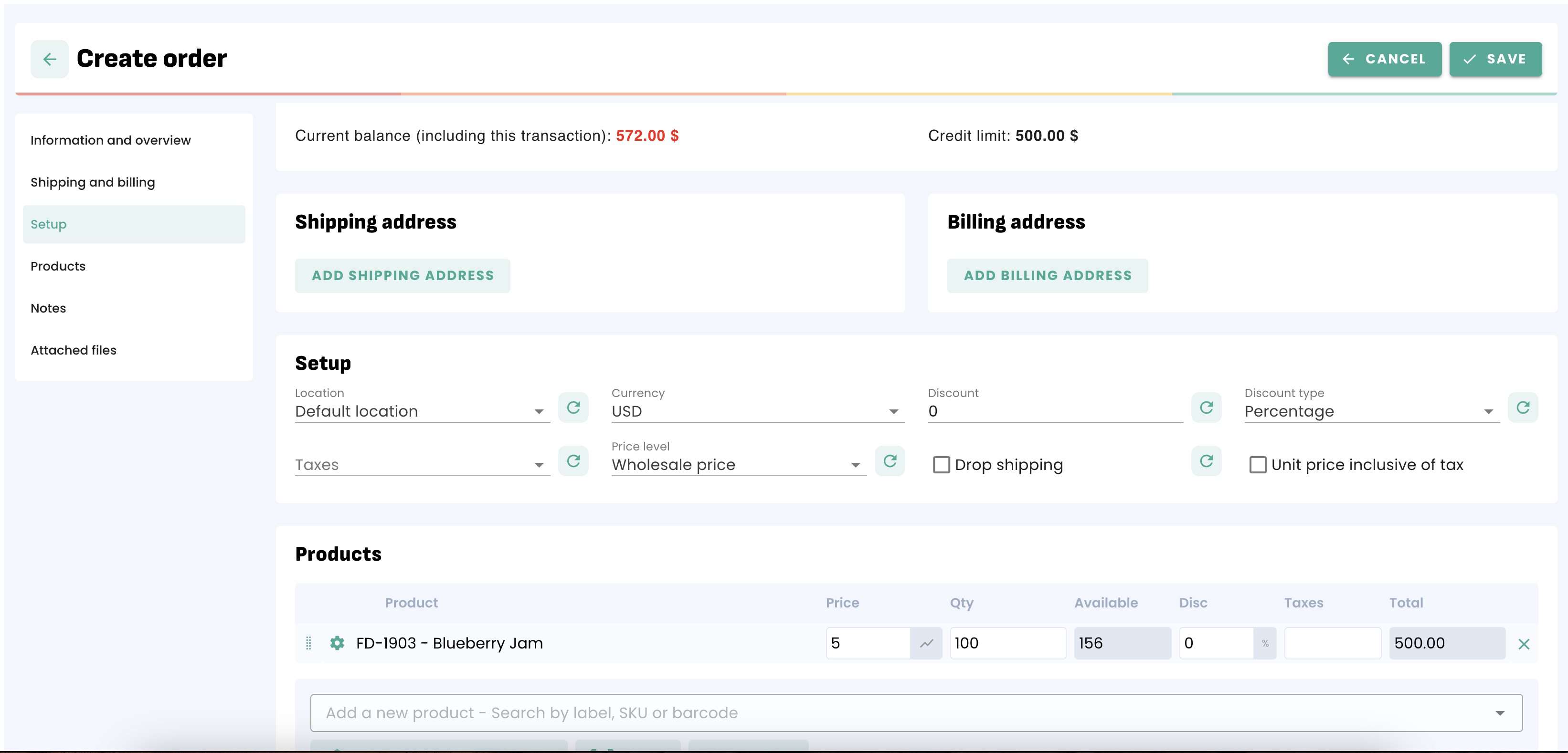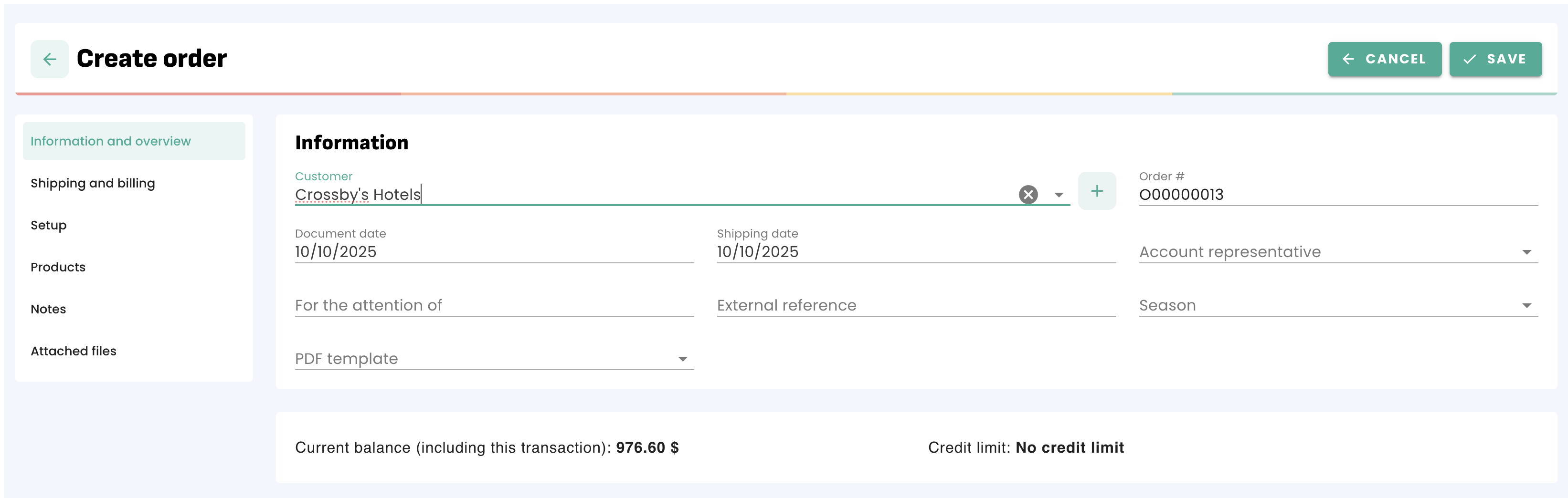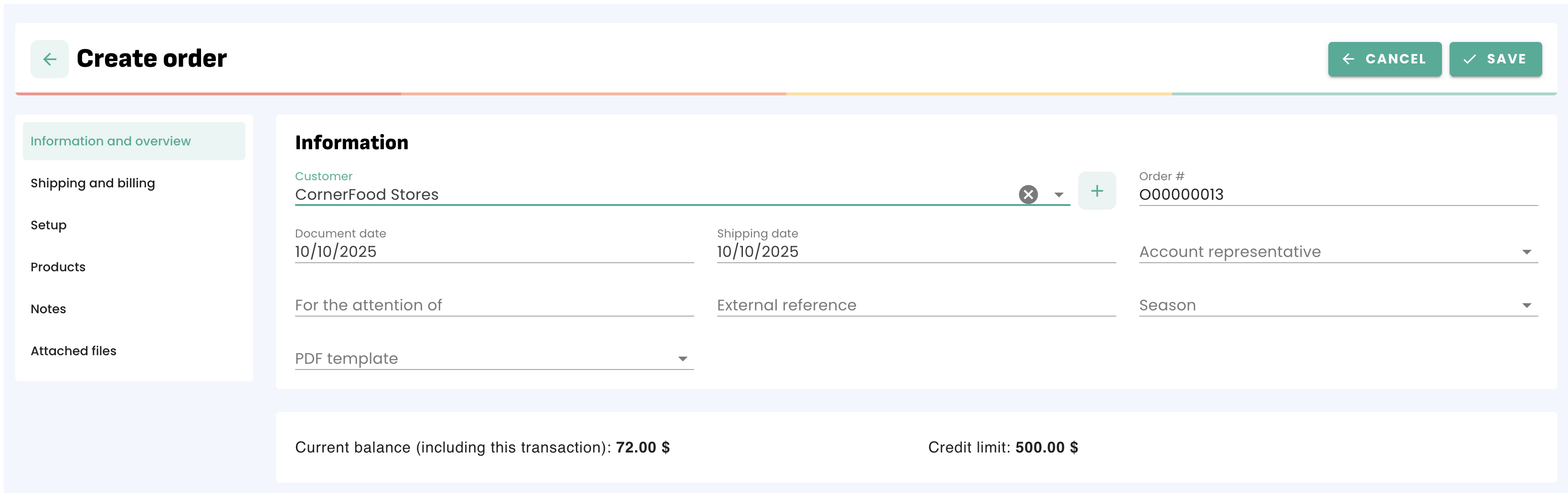 You can set credit limits for each customer. If you set credit limits for your customers, you will not be able to save a sales order or an invoice if the credit limit as been reached. The current balance is equivalent to the sum of all the ongoing operations with the client.