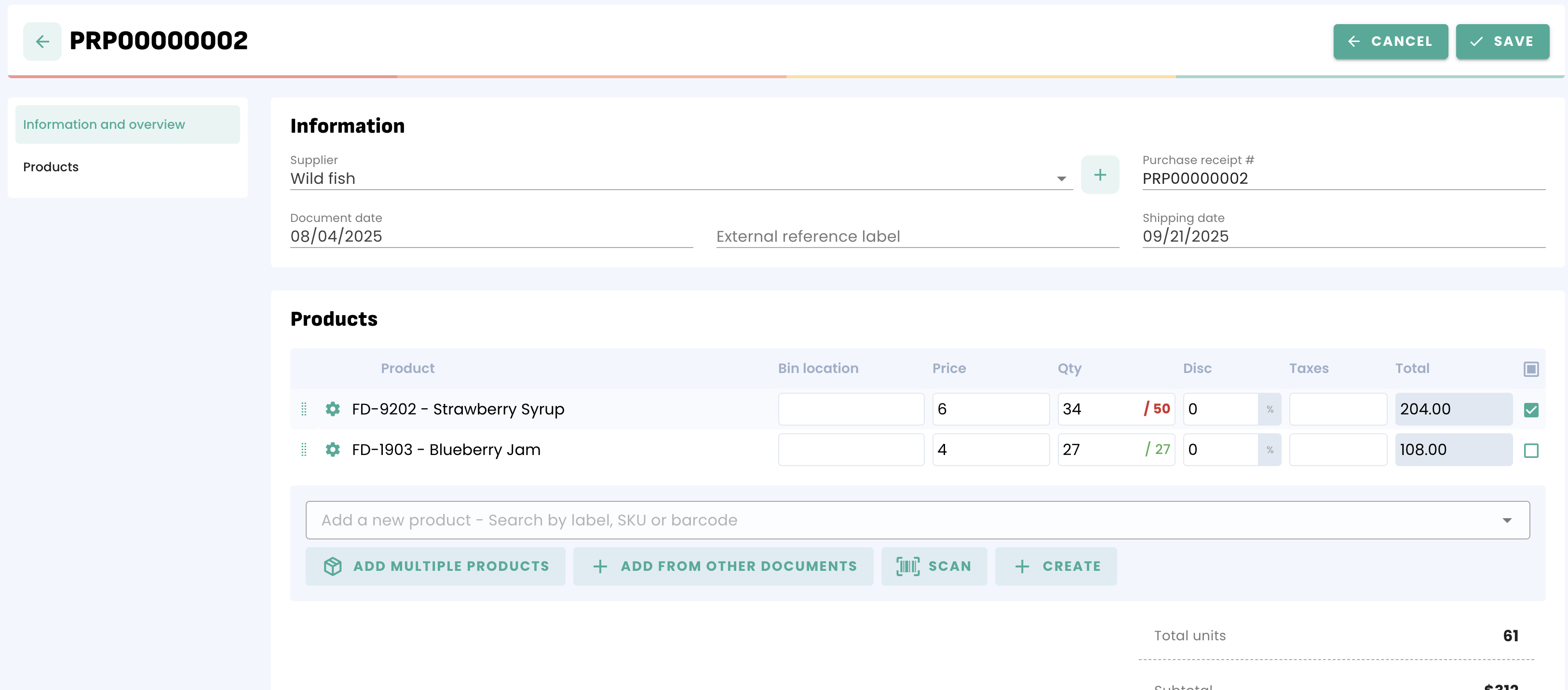 Once the purchase order has been created, you can start receiving the products. This starts by clicking on "purchase receipts" to create a first delivery. You then need to adjust the quantities for each product in the purchase order depending on what will be sent. You can also uncheck a product to keep it out of the shipment altogether and add it in a later delivery.