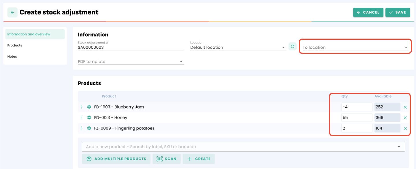 You then have 3 adjustment options. You can enter quantities on the product lines to make a stock entry. If you add a minus sign (-), it will be a stock removal. Finally, if you select a destination storage location, you can do a stock movement from one location to another.