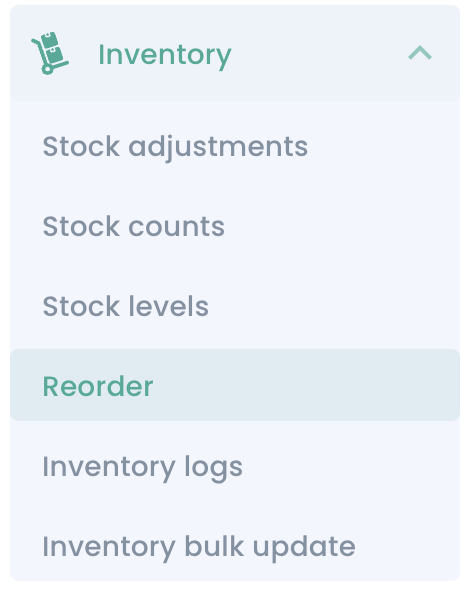 To access the Reorder report, open the reorder tab under the Inventory menu.