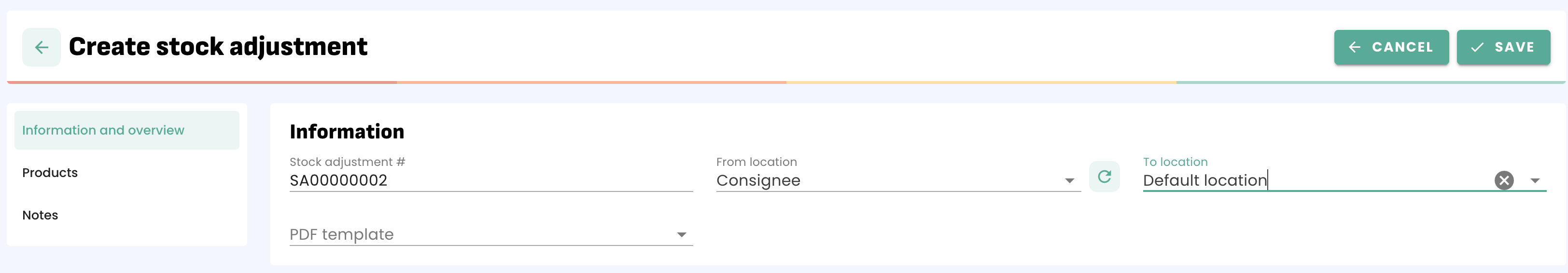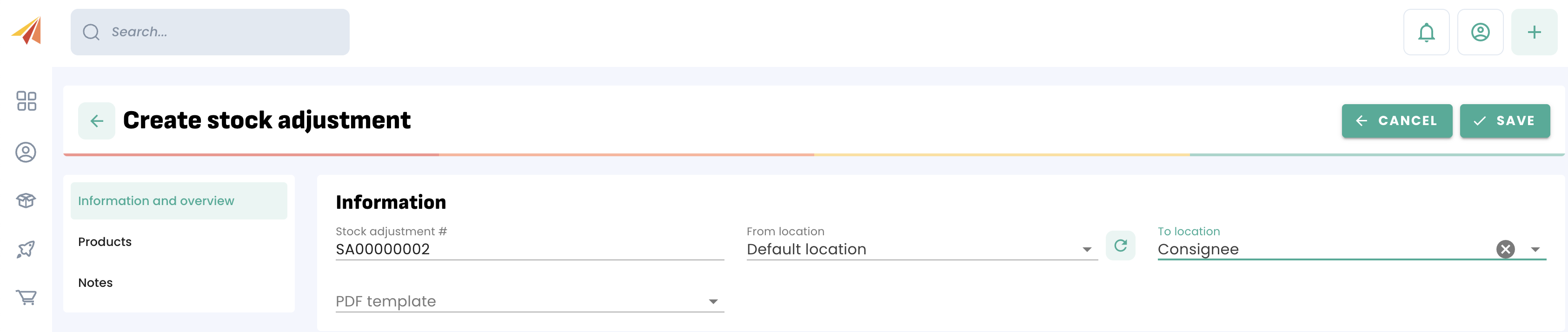 Inventory Menu > Stock adjustment > '+ CREATE'