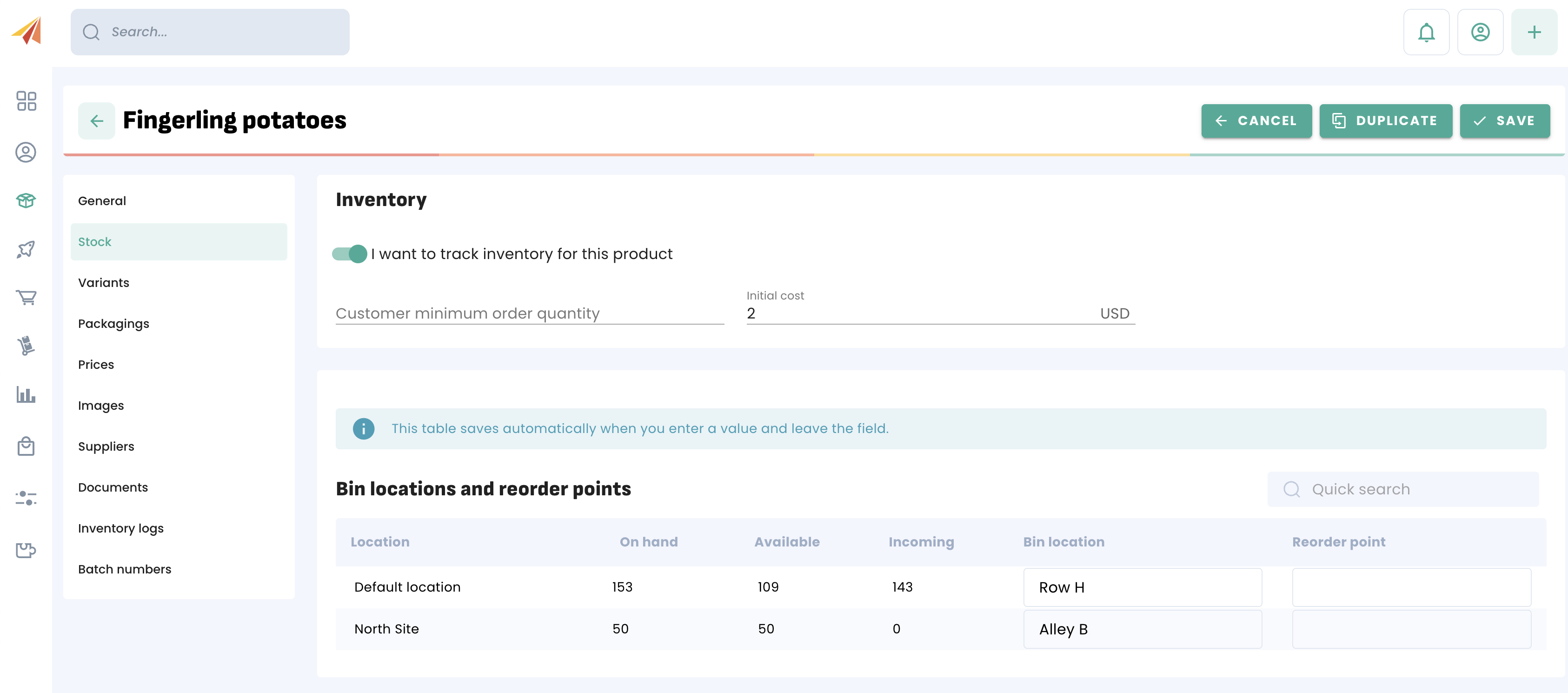 Open your product card and add your bin locations (if you use variants, open each variant card):