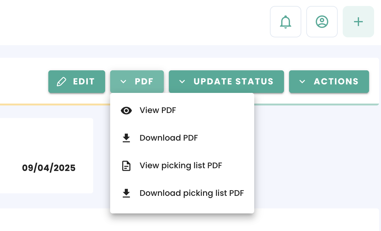 To generate a picking list, open a Shipping order and click 'PDF > View/Download picking list' from the top right end of your screen: