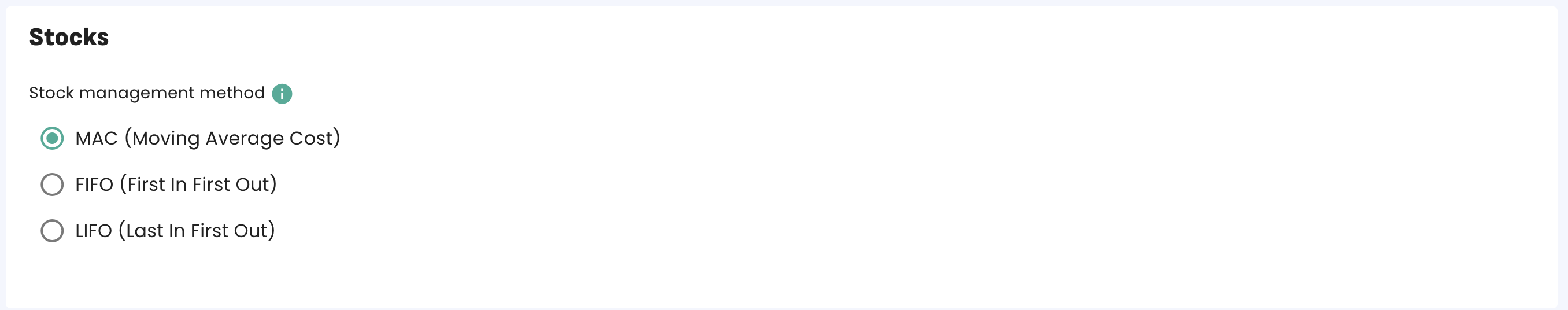 In Erplain, you can use the Moving Average Cost (MAC), the First In, First Out (FIFO), and the Last In, First Out (LIFO) methods to calculate product cost and inventory valuation.