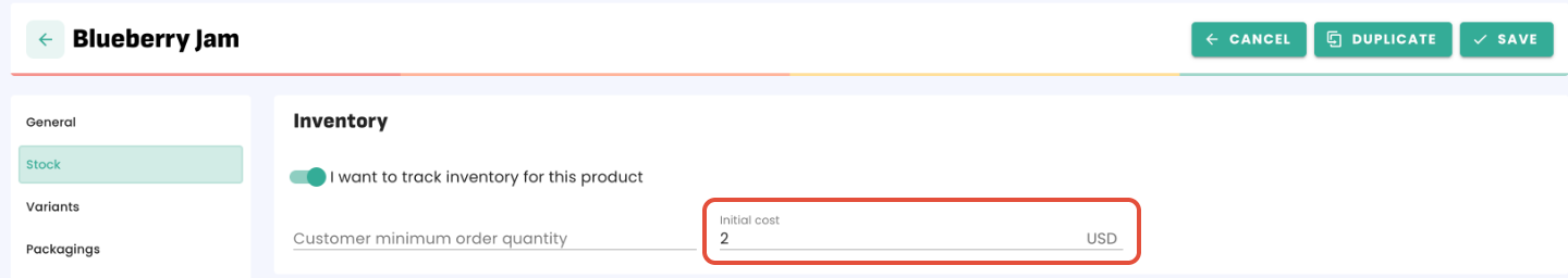 The initial cost (when creating a new product) is the starting point for cost calculation. If you don’t enter an initial cost, it will default to €0. You can update this field by editing the product in the “Inventory” section. Often, during setup, the initial cost may match the purchase price. The initial cost is a unit cost per product and must be in your account’s primary currency.