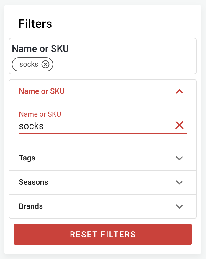 You can filter products by name, SKU or categories (Tags, Seasons, and Brands):