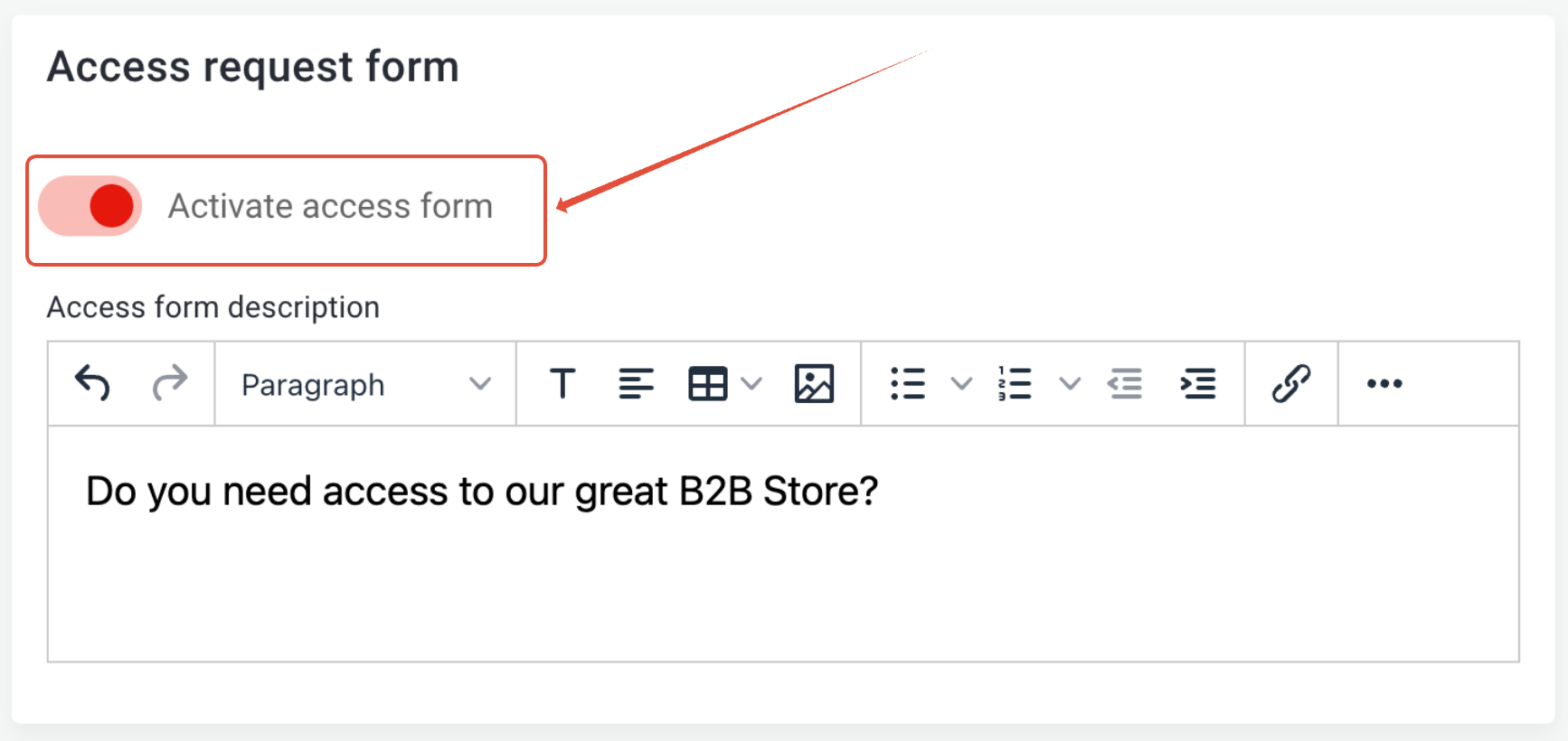 To enable this access request, go to the B2B Store setting menu > 'Access request form' tab. You can also enter a custom message that will be displayed on top of the request form: