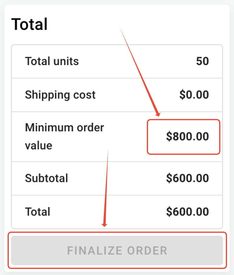 It will not be possible to finalize the order until the order amount hasn't reached the MOV: