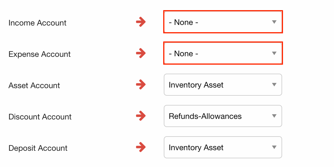 Invalid Number : _none Code: 2090 | Accounts are not set for your products. Check your QuickBooks ledger account settings and map your accouts. Additionally, make sure your accounts are active in QuickBooks. Apps menu > Configure QuickBooks > Ledger Accounts | Click here for more details. |