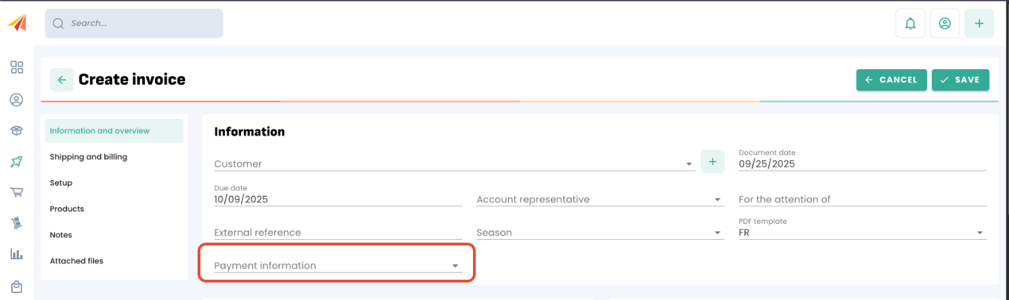 If you don't have a default payment information, you'll have the opportunity to select one when creating a sales document.