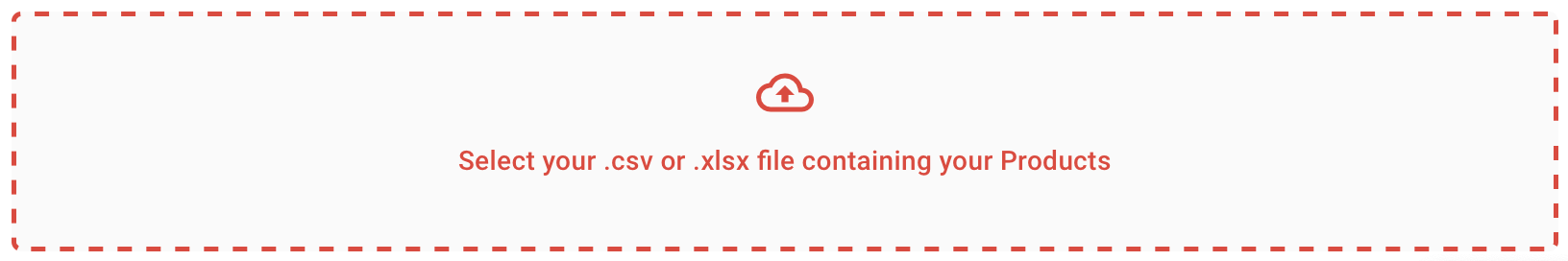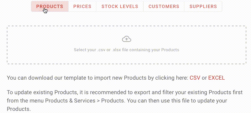 From the screen "Import data", select "Products" and click on "CSV" or "EXCEL".