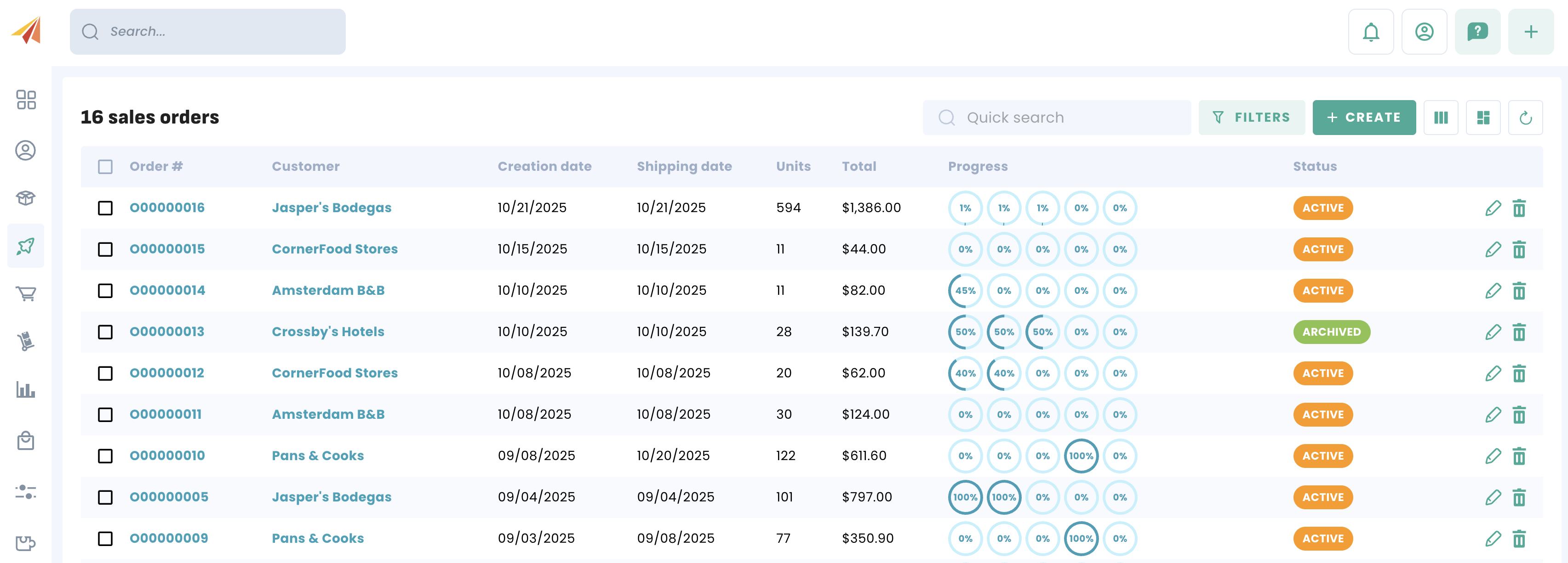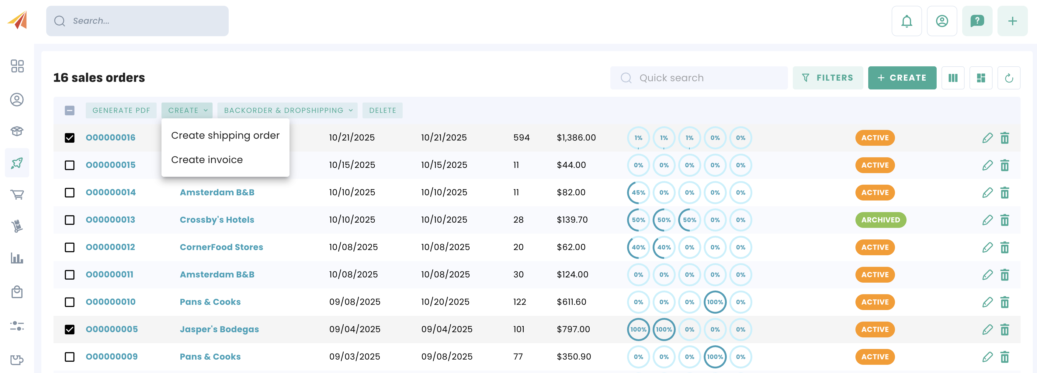 Then, just select the sales orders for which you want to create an invoice and click on “Create” then “Create invoice.”