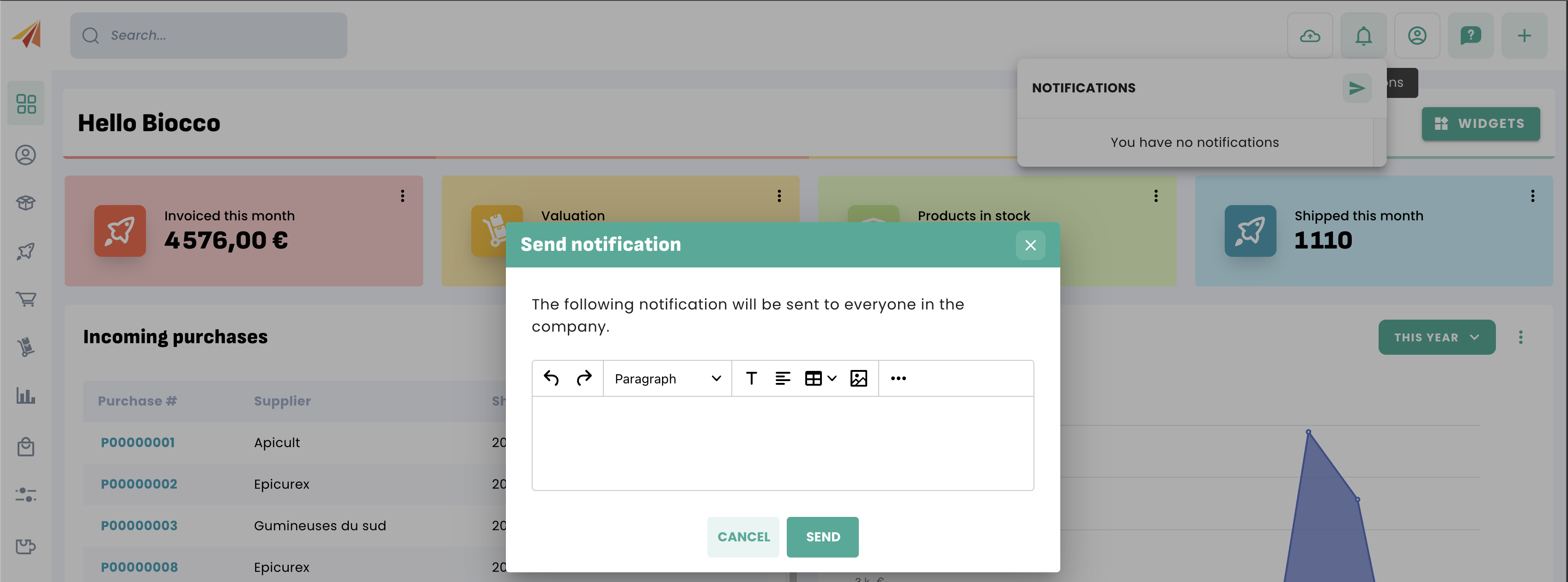 Erplain offers an internal notifications system, allowing users to send messages to their team directly on Erplain.