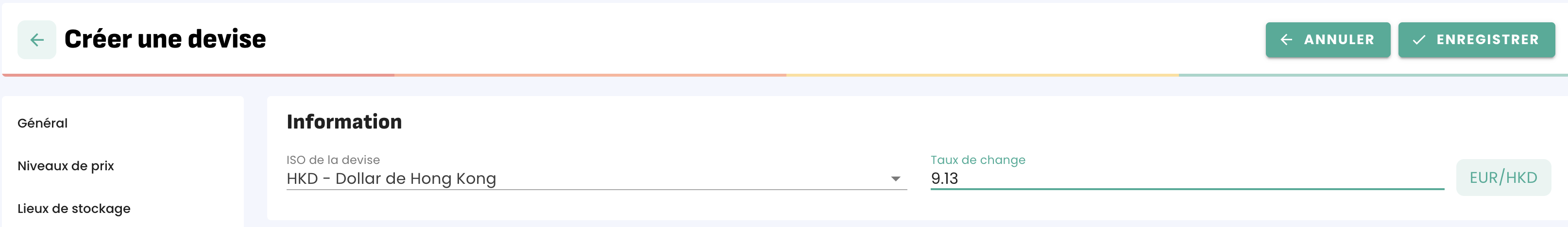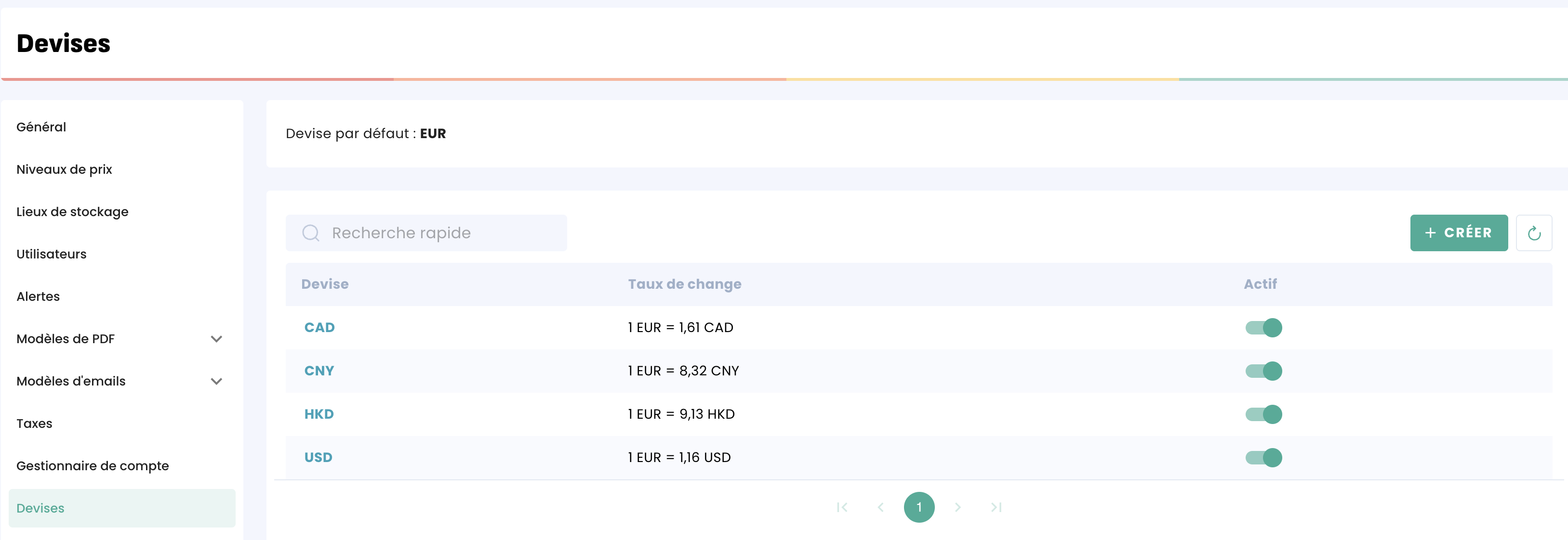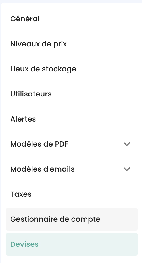 Pour créer et gérer vos devises, allez dans le menu "Paramètres" > "Devises" :