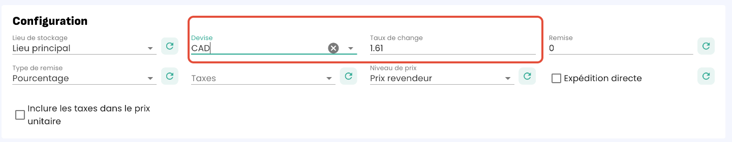 Le taux de change peut être modifié si besoin. Une fois le document créé, ce taux de change sera enregistré et assigné au document.