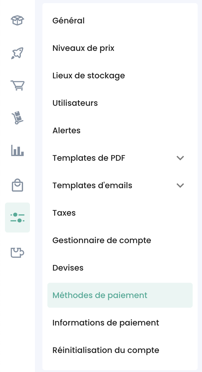 Vous pouvez créer et gérer vos moyens de paiement à partir du menu Paramètres > Méthodes de paiement :