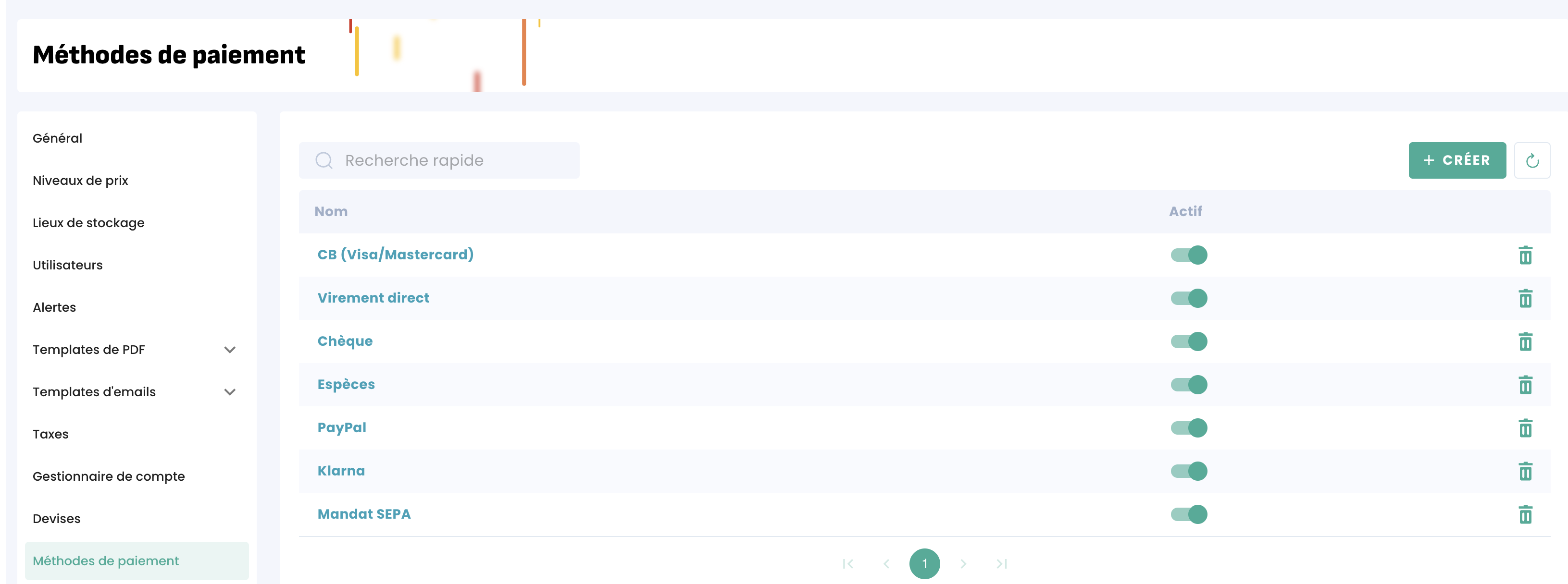 Vous pouvez créer un nouveau moyen de paiement en cliquant sur "+ CRÉER".