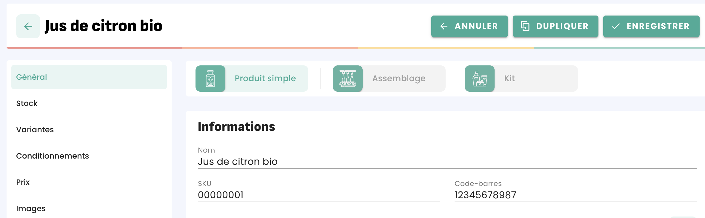 N.B. Erplain ne génère pas de code-barres. Vous pouvez utiliser des codes-barres existants sur vos produits ou bien créer de nouveaux codes-barres à l’aide d’un générateur de code-barres gratuit comme Tec-it.