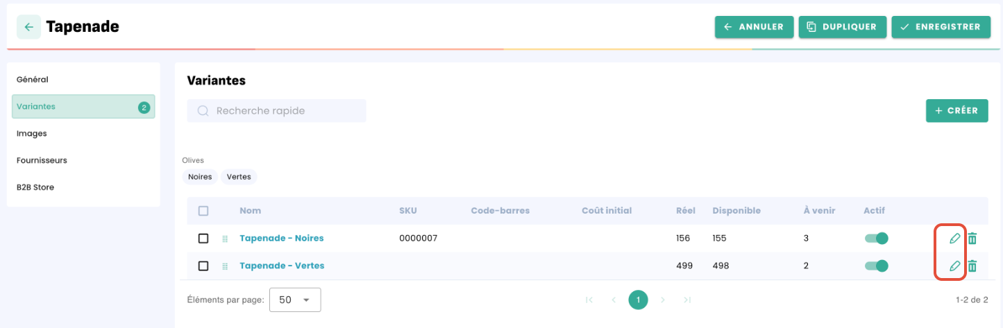 Si vous utilisez des variantes, vous pouvez attribuer des codes-barres aux variantes. Ajouter un code-barres à une variante peut se faire lors l'édition ou modification d'une variante. Ouvrez le produit et cliquez sur le bouton de modification des variantes :
