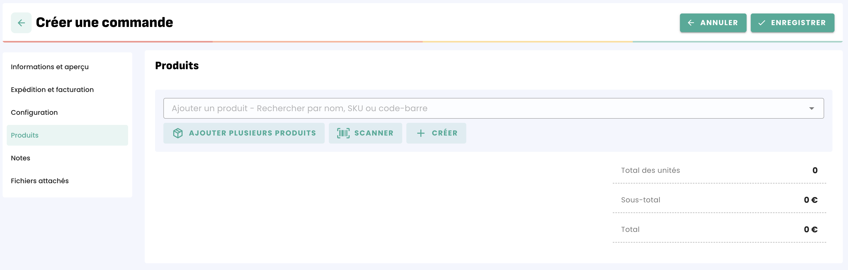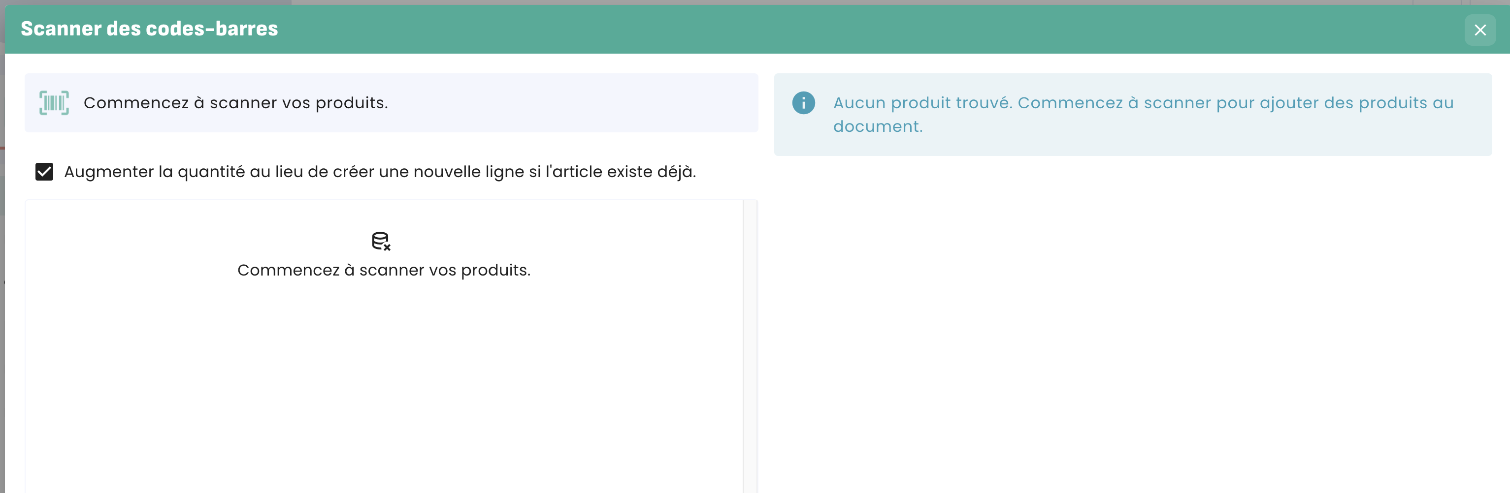 Une nouvelle fenêtre apparaît sur votre écran, scannez vos codes-barres, et s'ils sont attribués à des produits, ils seront ajoutés dans la liste. Vous pouvez scanner le code-barres plusieurs fois pour faire augmenter la quantité ou bien scanner une seule fois puis modifier la quantité associée directement à droite de l’écran.